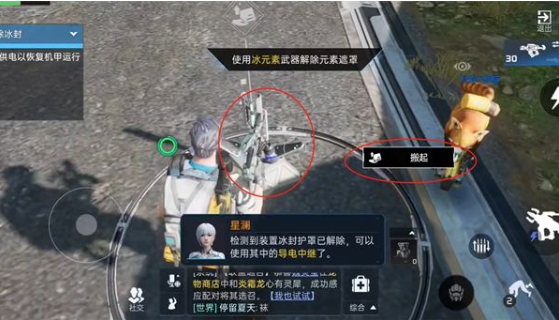 1、首先玩家需要将武器换上冰元素,用冰元素武器把发电装置解开,然后再解开两个传电器。