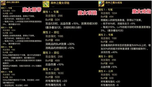 【魔女项链】:消耗品Buff、出血15%、全20、出血10%/单20,3个核心词条可换下“战神项链”。