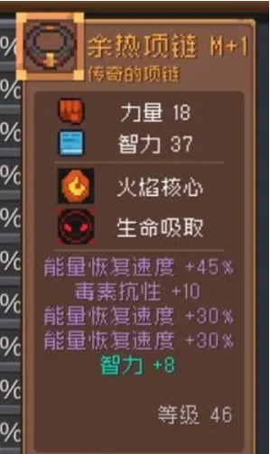 余热项链:这是一个传奇品质的项链,其基础属性中的力量与智力都达到了不错的水准,当然,它最令人看好的还是其技能,火焰核心可以让你在火焰元素层面获取更强的抵御能力和伤害输出能力,另外生命吸取也可以充分提升角色的续航,而且它可以强化多次以此来获取多个属性词条,这些词条如果能够刷到上图所示的能量恢复速度和智力,那么它的续航和输出作用都将被进一步放大。