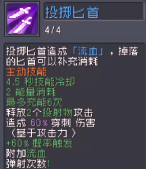 1、投掷匕首对敌人造成流血伤害,掉落的匕首可补充消耗。