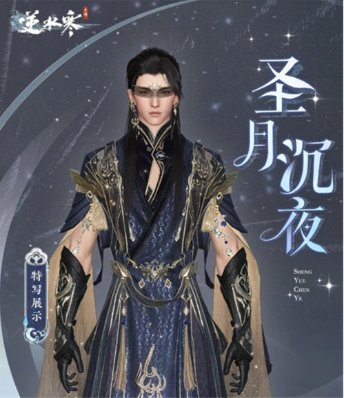 2、男性角色的圣月沉夜时装主要以蓝黑色为主,搭配金色线条点缀,给人观看夜晚星空的感觉。
