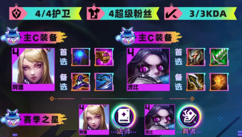 是一套以4费卡为主C和主坦的运营阵容,建议前期以连胜运营过渡为主。前期尽量以3超粉+任意法师开出3超级粉丝3KDA卡牌打工运营过渡。