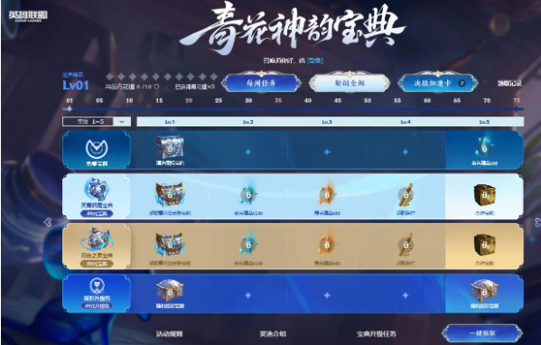 解锁宝典并完成任务提升宝典等级,共计可获得1个随机神话皮肤宝箱(开启后显示随机三款发售1年以上的优先奖池内未拥有海克斯/至臻系列皮肤,玩家可选择一款领取,若领取时已拥有奖池内全部皮肤,则获得125神话精萃)、1款全新青花瓷史诗皮肤、1个传说皮肤宝箱(优先奖池内未解锁皮肤)、1个随机皮肤宝箱(优先奖池内未解锁皮肤)、11个盲盒、25个神话精萃、5个杰作宝箱、5个海克斯科技神秘表情以及1900蓝色精萃,1550橙色精萃与15个海克斯钥匙碎片。