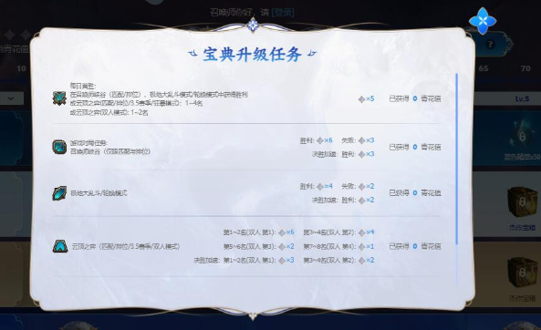 在召唤师峡谷(匹配/排位)或极地大乱斗模式/轮换模式中获得胜利:获得1~2名,或者在云顶之弈(匹配、排位、3.5赛季、狂暴模式)获得第1~4名,在云顶之弈(双人模式)中获得1~2名,奖励5青花。