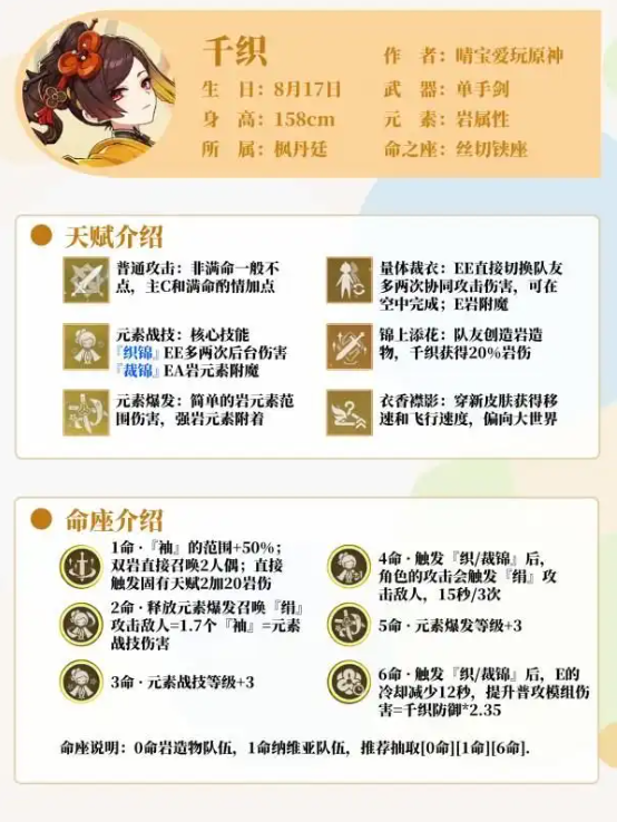 原神千织武器圣遗物怎么选择?队伍怎么搭配?原神千织是4.5版本中新出的角色,属于岩属性,使用单手剑武器,很多玩家在4.5更新后都抽取到了她,但是具体该如何玩,武器和圣遗物怎么选择,队伍怎么搭配呢?很多人估计还没有完全摸清楚千织的具体玩法,小编今天就给大家带来千织的最全面攻略,快来一起看看吧!