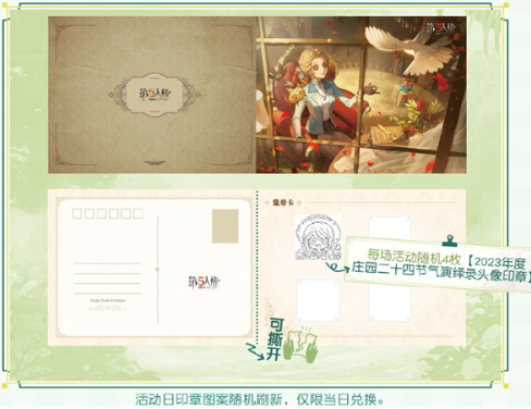 访客活动期间(4月20日-21日)带话题#第五人格24节气#打卡拍照/发布视频在微博超话 /小红书/抖音,或话题#第五人格二十四节气演绎录#打卡拍照/发布视频在哔哩哔哩,并@第五人格各官方账号,即算作有效参与活动。有概率获得官方翻牌。被翻牌的玩家可获得周边礼包一份。