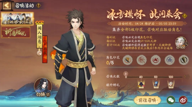 若已集齐对应5枚印花,或成功召唤SSR申屠子夜、SSR闻人翊悬后,重复获得的联动角色印花将转换为10枚对应角色契约书碎片。