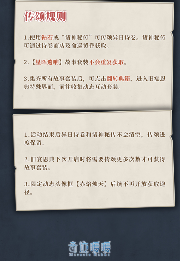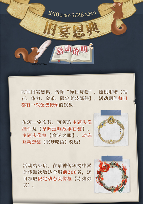 5月10日—5月26日,前往旧宴恩典,使用钻石或“诸神秘传”进行传颂,将随机附赠【钻石、体力、金币、限定套装部件】。活动期间每日都有一次免费传颂的次数。