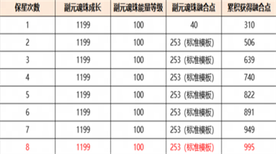 所以,建议少侠们第1次6星保星时副元魂珠能量至少要有40点;后续2-3次保星,副元魂珠能量至少不要低于主元魂珠,在自己能力范围内越高越好。并且因为后续保星收益会越来越低,追求副元魂珠的融合点达到提升上限值,会变得比较不切实际且不具有性价比。