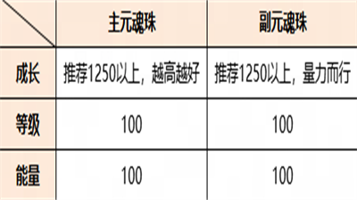 培养1个4星元魂珠,成长在1250左右,等级和能量均培养至100。