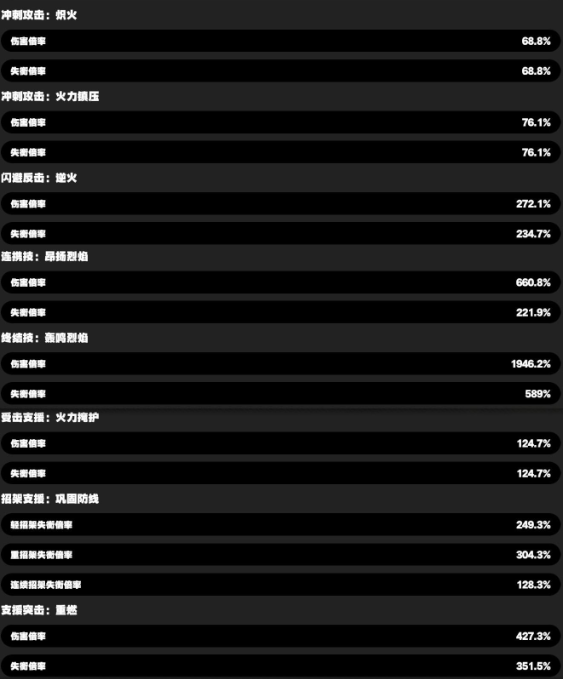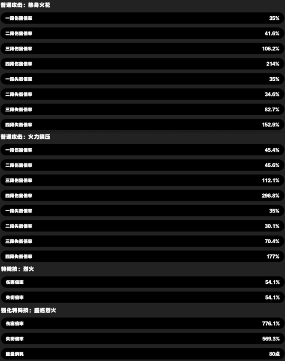 招式发动后,普通攻击和冲刺攻击必定触发火力镇压,最多持续15秒或触发8次,招式发动期间拥有无敌效果。