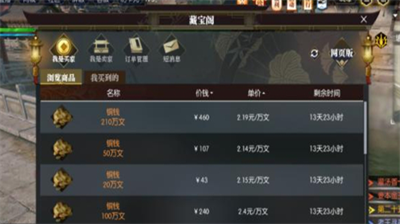 在藏宝阁中我们可以购买或者寄售大部分的非绑定道具,如材料、宠物、装备、金币