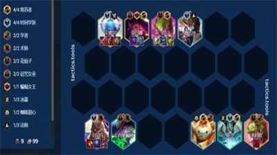 羁绊:4复苏 4时间学派 2学者 2术师 2花仙子 2诅咒女巫