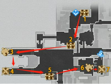 2、到达任务地点之后,我们按照标记好的路线寻找宝箱的位置,在这里我们一个可以收集到7个宝箱,第三个宝箱需要罗盘解谜才可以拿到,第四和第七个宝箱需要击败怪物才可以拿到,第六个宝箱需要魔方解谜才可以拿到。