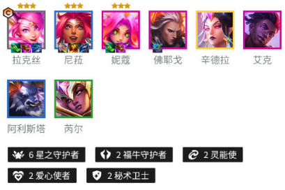2、阵容羁绊:6星之守护者+2福牛守护者+2灵能使+2爱心使者+2秘术卫士。