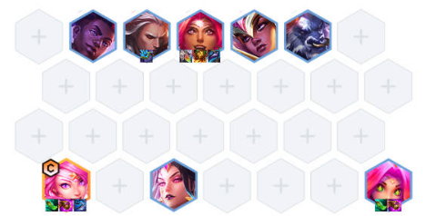 1、阵容组成:拉克丝+尼菈+妮蔻+佛耶戈+辛德拉+艾克+阿利斯塔+芮尔。