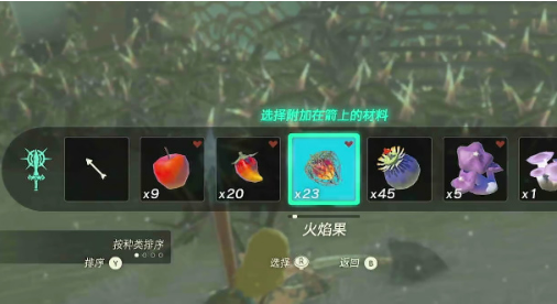 2、因为是下雪天,所以我们使用火焰果也是可以的,将火焰果附加在箭上面,然后射出去的箭就有了燃烧的作用。