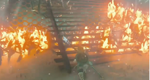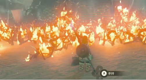 3、对准这些荆棘处,然后将附加了火焰果的箭射进去,这周围就是都会燃烧起来,等待烧完有了路就行了。