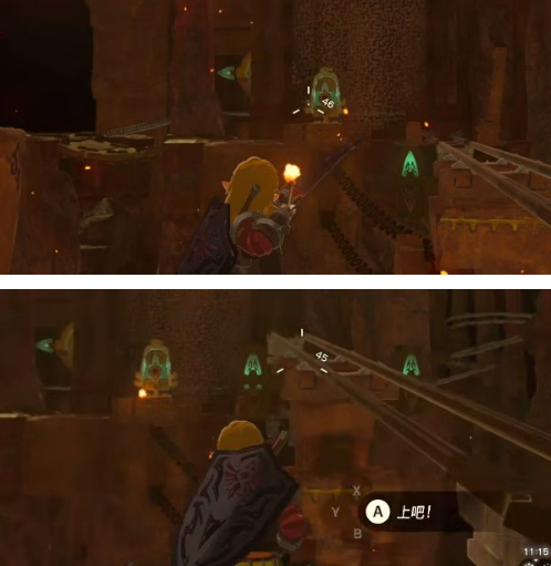 3、一直往前走,使用弓箭击中对面的机关,轨道会改变成向上。