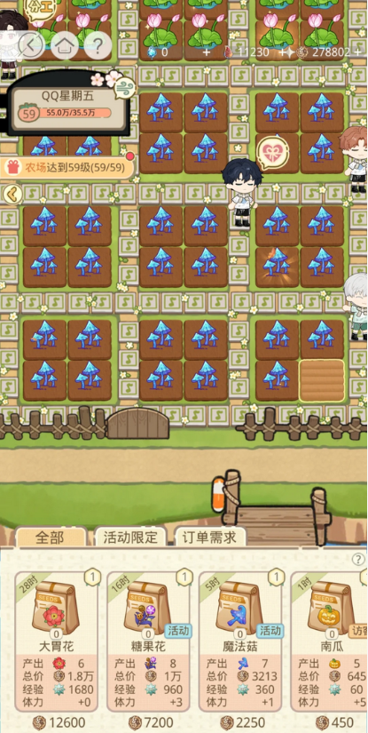 每天把免费体力用满,睡前种长时长作物(比如糖果花),碎片时间种短时长的魔法菇/南瓜,我今天刚种了20块糖果花田,进度已经涨了20!