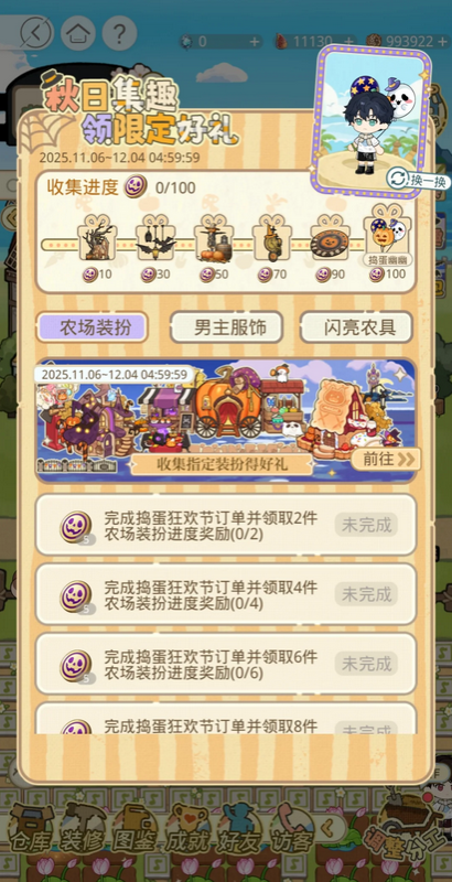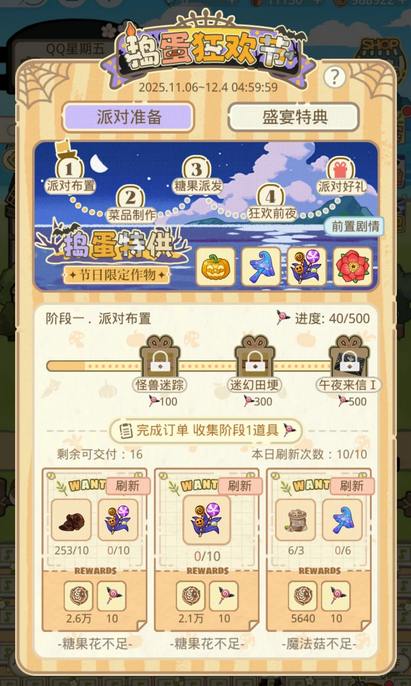 活动分“派对布置→菜品制作→糖果派发→狂欢前夜”4阶段,当前先冲派对布置:完成订单攒“魔杖道具”涨进度(现在我进度才40/500),进度到100/300/500能解锁“怪兽迷踪”“迷幻田埂”这些万圣节装扮,后续阶段要等前置做完才会开~