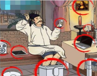 1、地上的扫地机器人、床上的平板、音箱、李白手机面拿着的手机、墙上挂着的蒙娜丽莎还是假的、桌子上面的电脑。