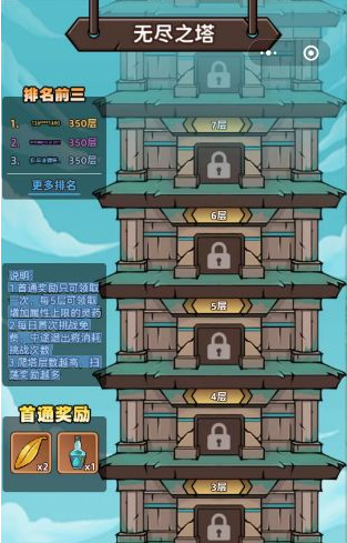 1.首通奖励只可领取一次,每5层可领取增加属性上限的灵药;