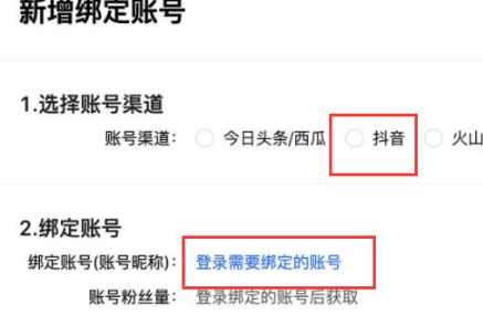 3、接着选择渠道“抖音”,点击“登录需要绑定的账号”