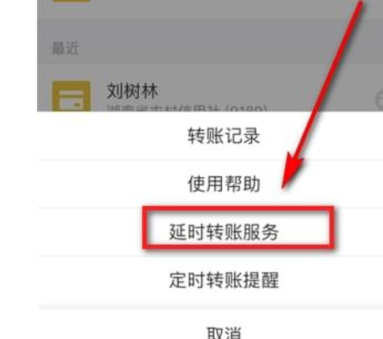 3、在弹出的窗口中选择【延迟转账服务】(小助用的是苹果版所以在下面,如果是安卓版弹出窗口应在右上角)