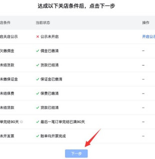5、然后我们需要满足图示的所有条件才可以进行关店,全部满足后即可点击“下一步”
