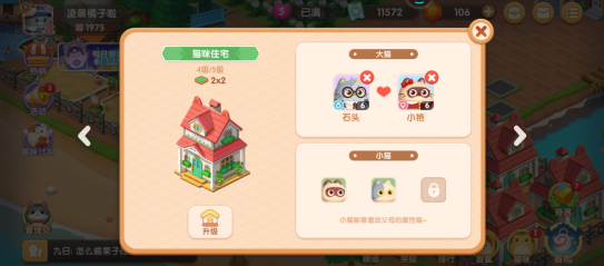 品质不同的猫咪是可以生小猫的但是加成不一样,橙色和橙色生出来的加成最高,猫咪住宅等级越高最多可以生3只小猫咪;