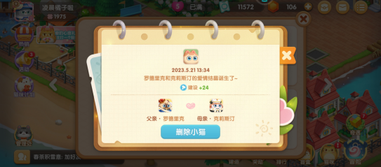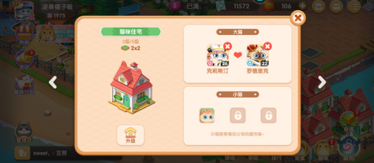 注意:品质高低省出来的小猫加成是不一样的,两个不同的小猫住在一起一晚上基本上是可以生出来一只小猫咪的,小猫咪无法成长,只能用于加成,我们也可以选择删除猫咪或者更换配对的猫咪;
