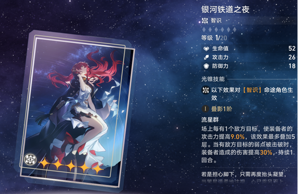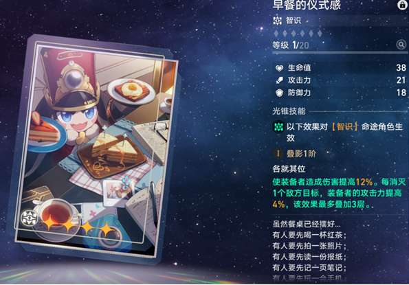 让景元在面对复数敌人时获得攻击力加成,敌人弱点被击破时获得高额追加攻击伤害加成,光锥效果与景元不是很契合,但如果环境适合,景元能够吃到大部分增益的话也算的上是景元光锥的优秀选择;