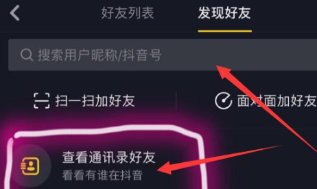 3、打开后,在上方可以通过昵称或抖音号搜索,下方可以查看通讯录或qq/微信好友。