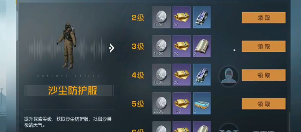 4、1级沙尘防护那是在4级时解锁,解锁后在衣橱上衣处,想平安进入沙漠封禁区黄就得将探索等级提升至26级解锁2级沙尘防护服,沙尘防护服也是会扣血,但速度很缓慢。