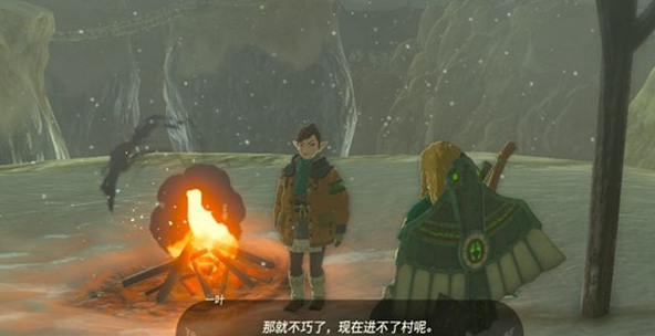 2、不过想要进入利特村的桥梁断掉了,这里需要利用风流飞过去,在这里会看到一叶在篝火旁边,我们丢进海拉鲁球果进篝火堆里。