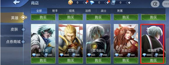 2.第二步:在英雄一览里面就可以找到【唱跳王子】也就是蔡徐坤的皮肤,点击进入就可以购买了;