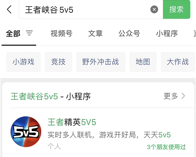 1、进入微信,在微信的搜索框内搜索【王者精英5v5】,进入小程序体验就可以了。