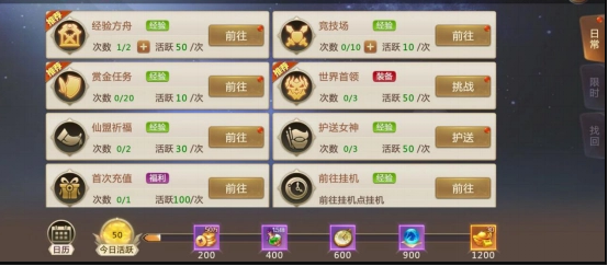 1.修仙论道:周一至周二五个日常时间点内皆可参加,可获得大量经验点,如果没时间的话,也可以不做,通过日常任务弥补。