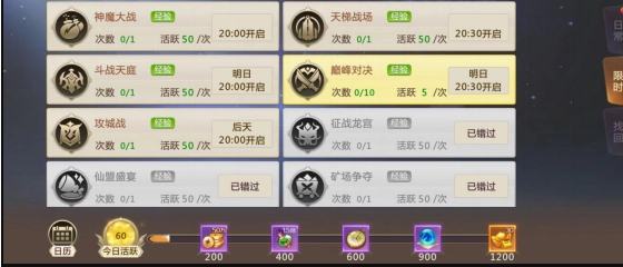 4.仙盟盛宴:周三至周日19:30可参加,可获得神兽精元和极品武器,参与时间还充裕,可以说是必做任务。