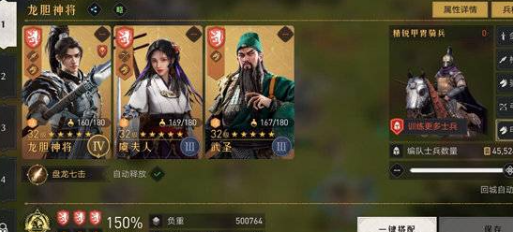 以赵云为核心的连击阵容,有很高的爆发力,以超高的伤害终结战斗,在前期无论是PVP还是PVE都是非常好用的,可以帮助玩家快速发育。该阵容包含了龙胆神将(解锁手册获得)、虞夫人(免费送)、武圣(首充获得),获取方式都比较简单,对于平民小氪玩家来说是一个不错的选择。在兵种选择上使用骑士,这三个英雄都是具有骑士羁绊的,其中龙胆神将主力输出,虞夫人在三号位给他们两个加状态。