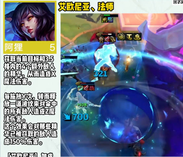 1:阿狸,羁绊为艾欧尼亚,法师,技能效果是窃取当掐你目标和3.5格内的四个额外敌人精华,从而造成一定的魔法伤害,每释放n次,转而释放一道波纹对于命中的所有敌人造成一定的魔法伤害,这个效果会对那些精华已经被窃取的敌人造成百分之一百五的伤害;