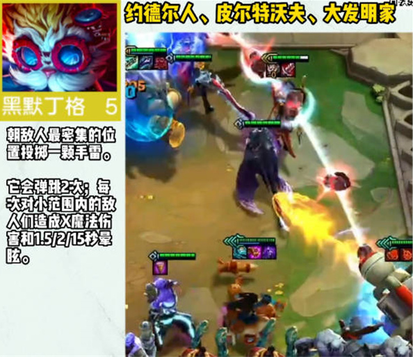3:黑默丁格,约德尔人,皮尔特沃夫,大发明家,超低人最密集的位置投掷一颗手雷,它会弹跳两次,每次对小范围内的敌人造成一定的魔法伤害,和1.5秒,2秒,15秒的眩晕;