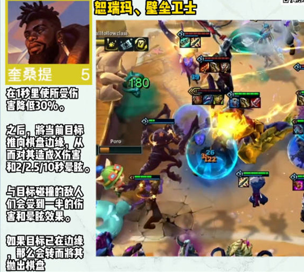 4:奎桑提,恕瑞玛,壁垒卫士,在一秒中使所收到的伤害降低百分之三十,之后,将当前目标推向棋盘边缘,从而对其造成一定的伤害和2秒2.5秒,10秒的眩晕,与目标碰撞的敌人,会受到一般的伤害和眩晕效果,如果目标已经在边缘地区,那么转而将其抛出棋盘;