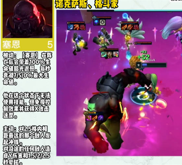 6:塞恩,诺克萨斯,格斗家,被动,塞恩在阵亡后会带着百分百生命值回光返照,每秒衰减7,5,0最大生命值,他在这个状态下无法使用技能,但是免疫控制效果,并且获得一定的攻击速度,主动,对于2.5格内相距最远的敌人发起冲锋,对沿途的任何敌人造成一定的伤害和1.5秒,2秒,2.5秒的眩晕;