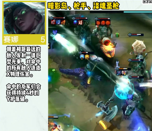 7:赛娜,暗影岛,枪手,涤魂圣枪,朝着相距最远的敌人发射一道巨型光束,对命中的敌人造成一定的物理伤害,命中的友军会获得持续四秒的护盾;