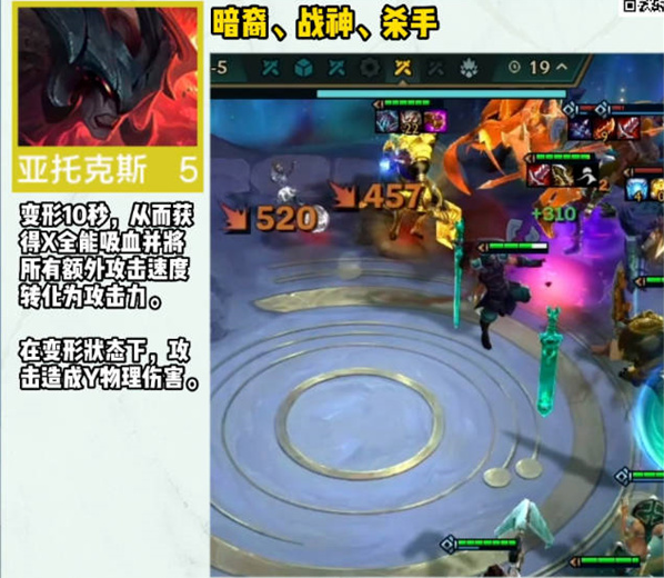 8:剑魔,暗裔,战神,杀手,变形十秒,从而获得一定的全能吸血,并且将所有的额外工具速度变成攻击力,在变形的状态下,攻击造成物理伤害。
