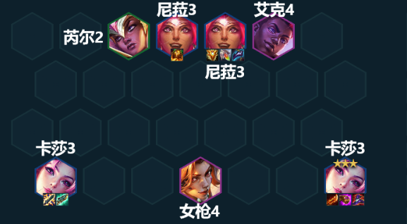 2.没有拿到芮尔-坚守防线的情况下,升7人口后攒钱慢D三星卡莎和三星的尼菈。 因为在这种情况下,一般会使用尼菈作为主t,7人口搜三费卡的概率为35%,和8人口并列最高。