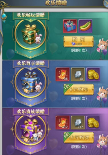 活动期间可在欢乐馈赠中购买多档礼包,助力乐园追放,礼包有购买次数上限。