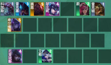 阵容搭配:厄斐琉斯、大虫子、鳄鱼、蔚、寒冰、雷克塞、猪妹、塞恩、卑尔维斯